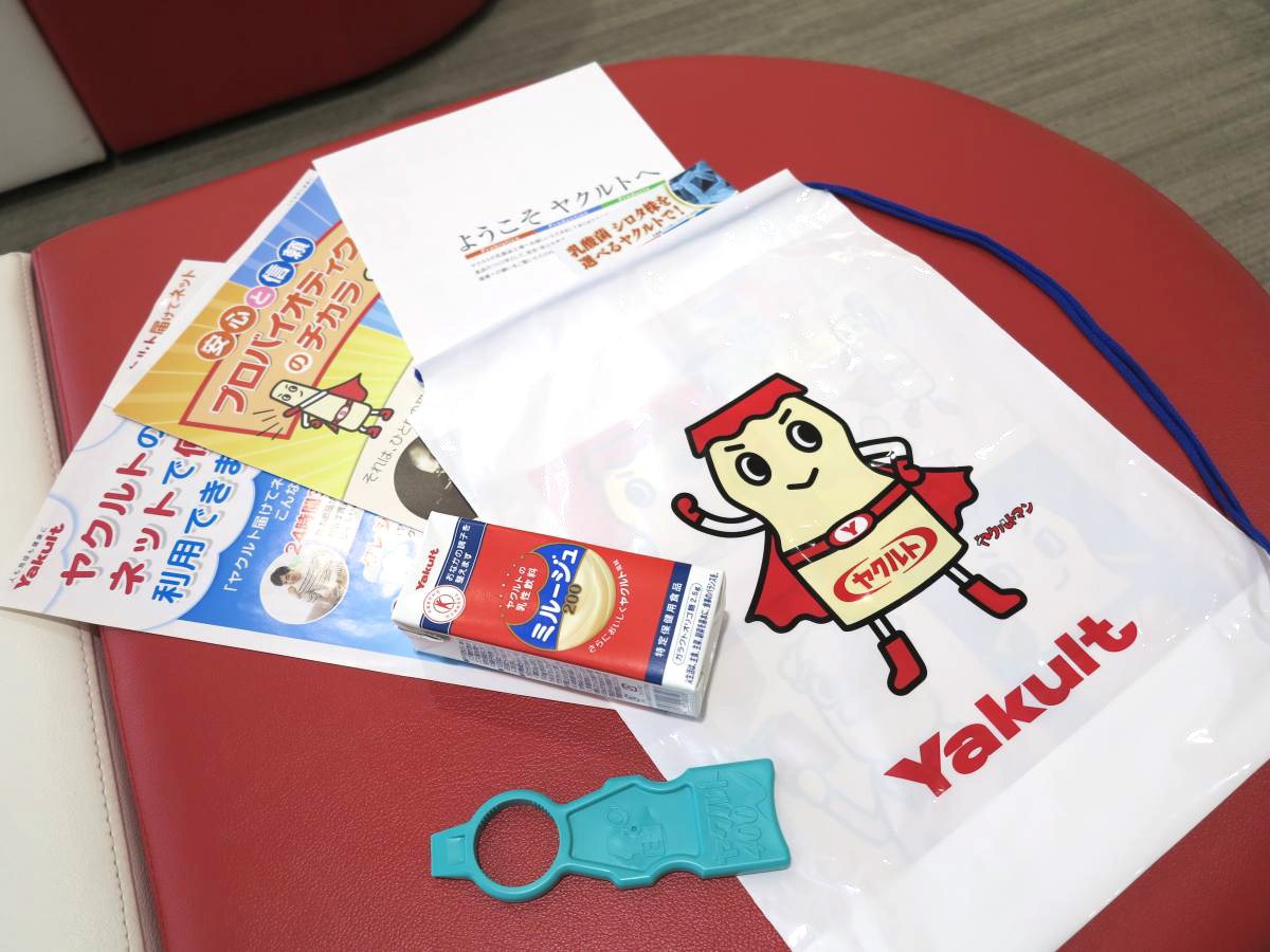 ヤクルトは温度管理が大切なのでお持ち帰りできませんが、「ヤクルトの乳性飲料 ミルージュ200」と、ヤクルトのボトルをリサイクルして作られたペットボトルオープナーなどが入って、もちろん見学は無料。