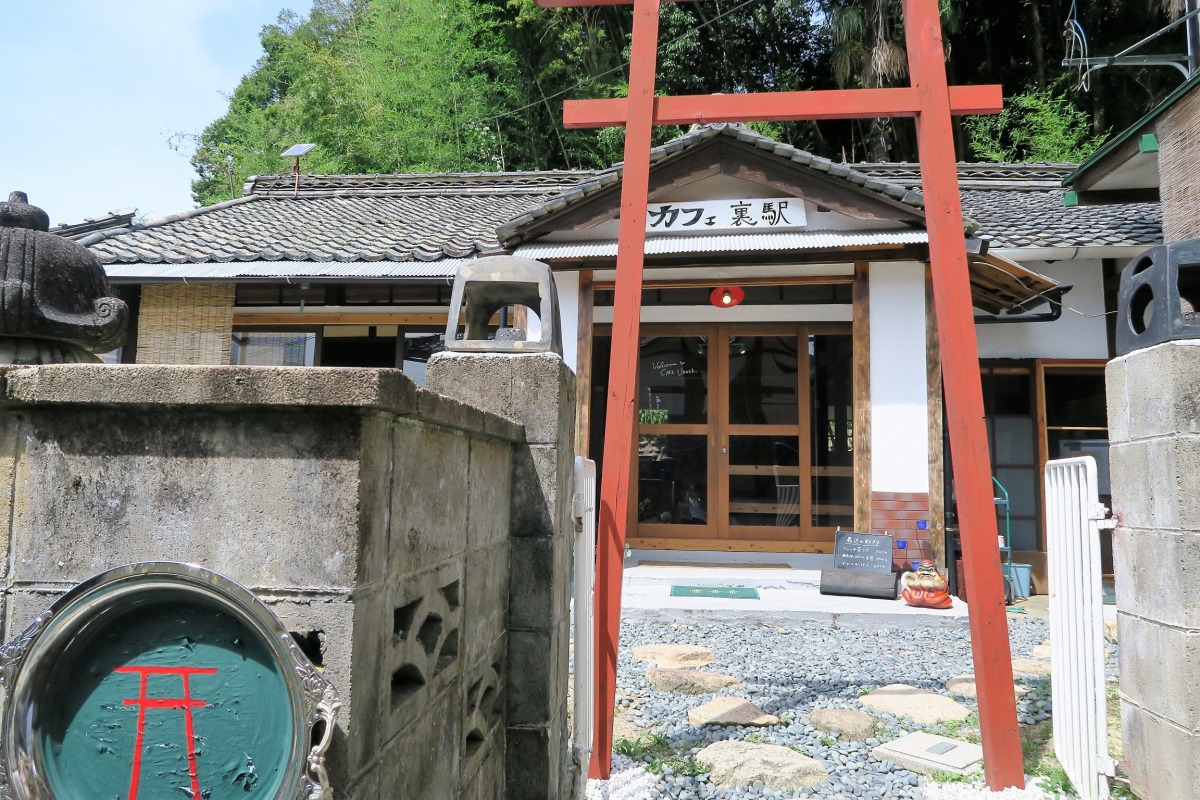 JR備中高梁駅から車で5分、徒歩10分。住宅街の中に神社やお寺が残る街並みのなかにある「カフェ裏駅」