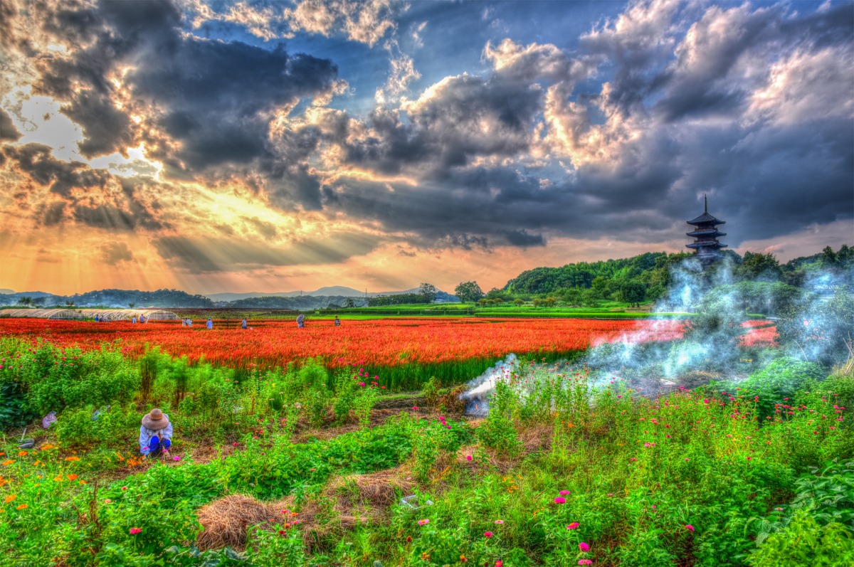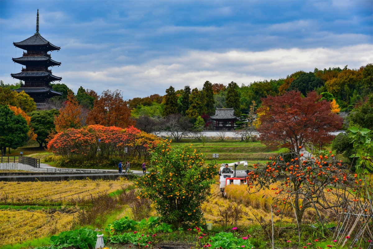 県道270号線(清音真金線)の道路横から撮影した写真です。地元の方が、畑で作業されている秋らしい風景です。畑や赤米田んぼは、立ち入り禁止です!赤米や五重塔も見えて、太陽からの光芒(こうぼう)もダイナミックで美しいです。