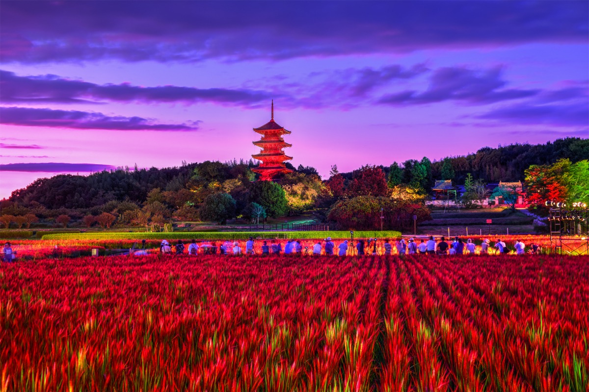 夕陽とライトアップの赤い光に照らされた赤米と五重塔の風景は美しいです。観覧場所には多くのカメラマンや見物の方がおられます。