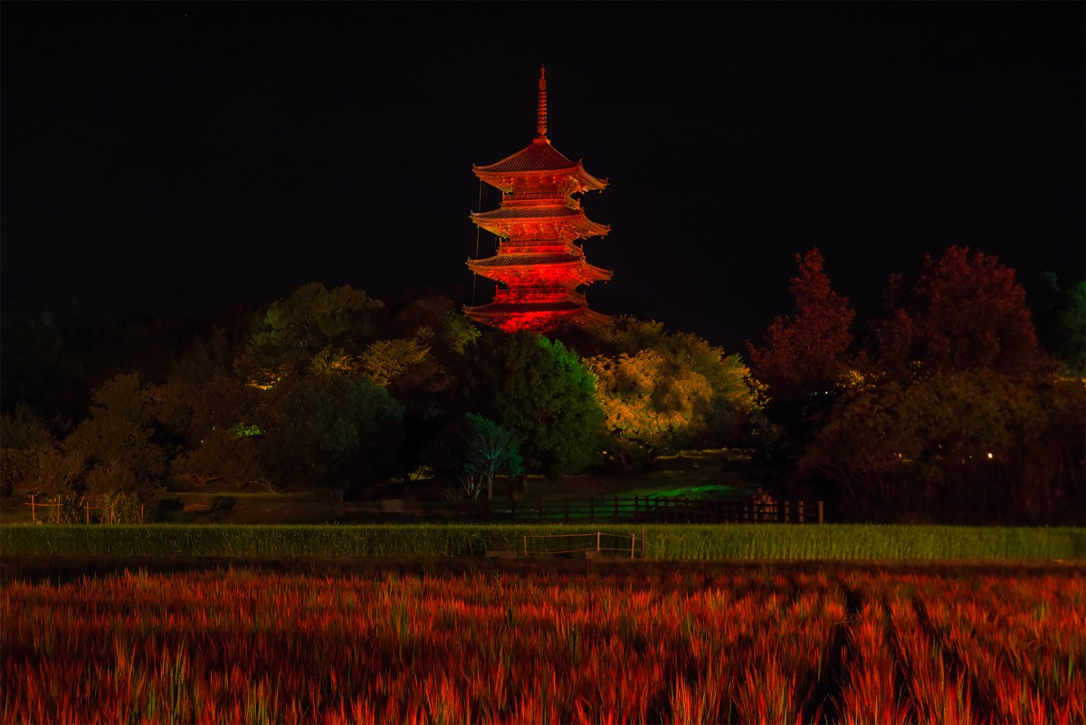 毎年9月中旬に開催される「赤米フェスタ」の前日や当日に、備中国分寺や赤米の田んぼが「赤い稲穂の夕べ」という赤色にライトアップされます。