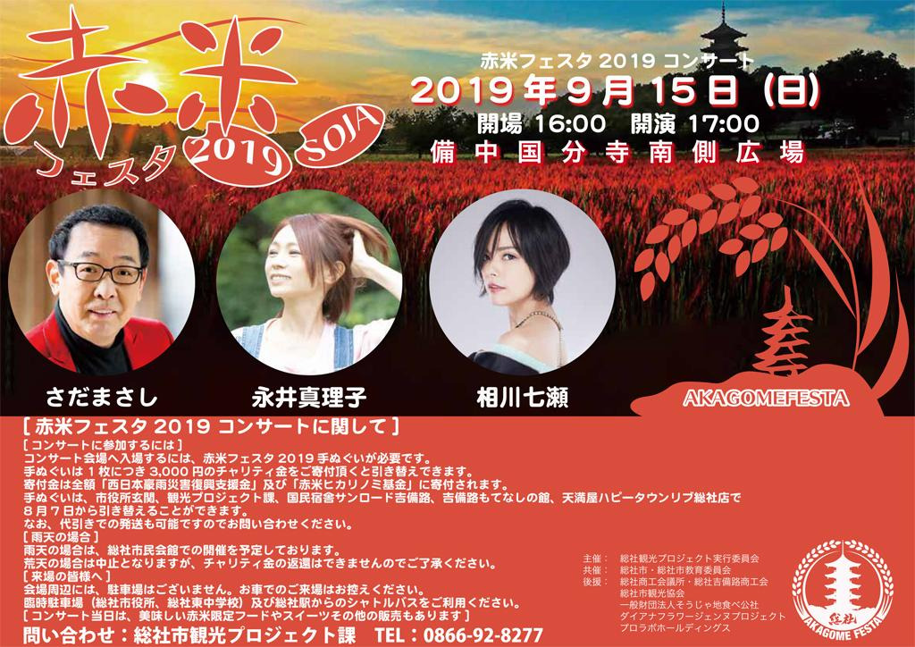 毎年、9月中旬の休日に、「赤米フェスタ・コンサート」が開催されます。総社赤米大使の相川七瀬さん以外の出演者は、年によって変更になります。