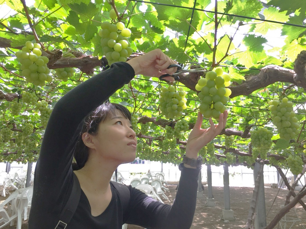 品種は、岡山が全国生産量第1位を誇り、クレオパトラが好んでいたことから「果物の女王」と呼ばれる高級ぶどう、「マスカットオブアレキサンドリア」です。女王の名にふさわしい香り高いぶどうを、岡山ならでは、贅沢すぎる「食べ放題」で、心行くまで楽しみました!