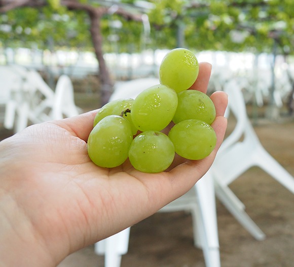 狩るのは一人一房で、ビニールハウスの中にテーブルとイスがあり、その場ですぐに食べることができます(一房を食べきれなければ持ち帰りも可能)。一房食べ切ったあとは、園内でおかわり用のマスカットを食べ放題!