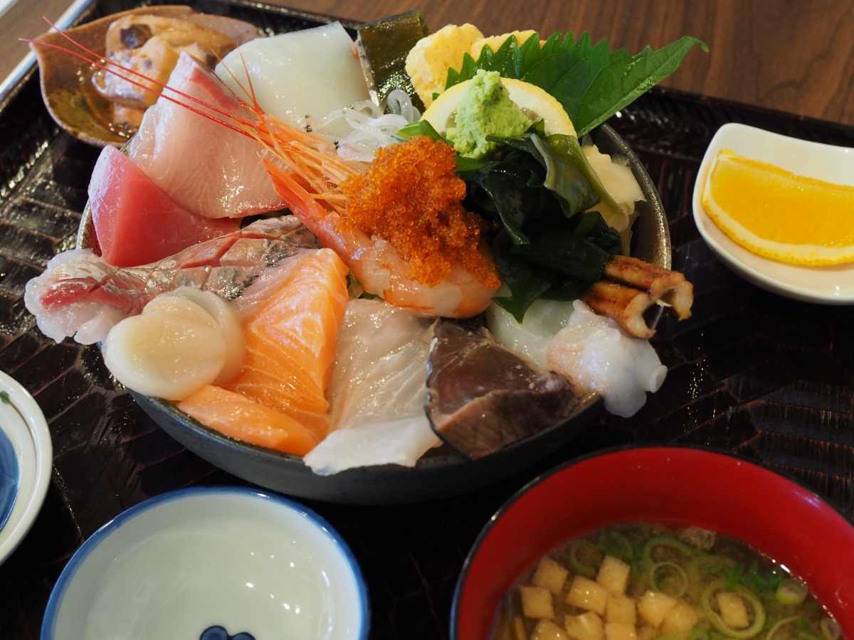 瀬戸内海を眺めながら走ったら、やっぱり食べたい海の幸! 大満足の海鮮丼を発見しました。大畠漁港の近くにある、DREAMS COME TRUEが大好きなご主人が切り盛りする「ドリカフェ」の「ずごうまい丼」(1,500円(税込)2019/9/28現在)です。
