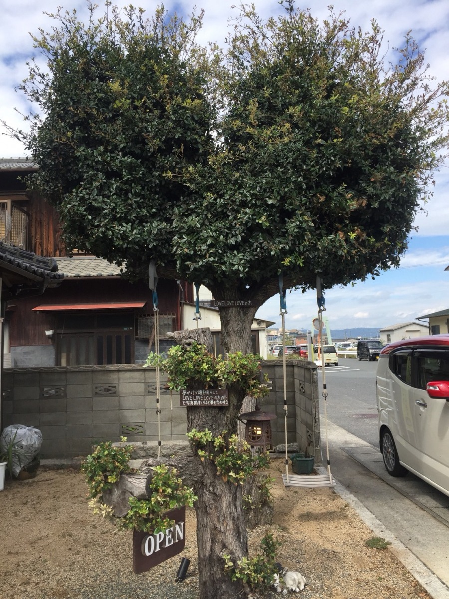 古民家カフェの入り口にあるハートのかたちをした「LOVE LOVE LOVEの木」。ブランコもついて、かわいらしいフォトスポットです。