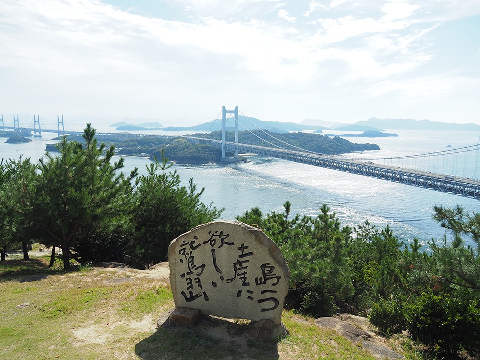 さらに先へ進むと、東屋(あずまや)展望台からは、瀬戸大橋を真正面に見ることができます。散策していて突然この絶景が現れるので、とても感動しました。山頂から少し離れていますが、行く価値ありです。