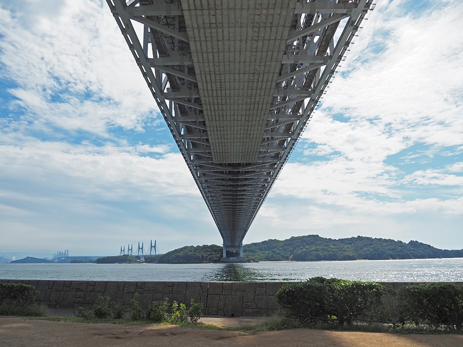 瀬戸大橋を真正面に見たあとは、真下から見られるスポット、田土浦公園へ行くのがおすすめです。時々、電車が橋を通る音が聞こえます。