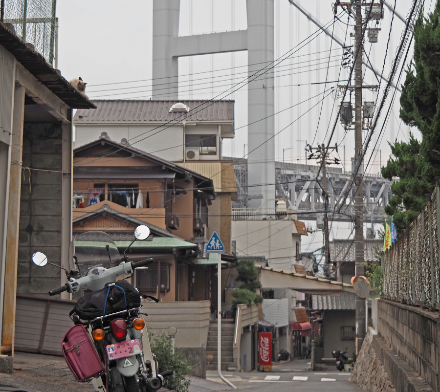 下津井をドライブ中は、古き良き港町にニョキっとそびえる近代的な瀬戸大橋とのコントラストも楽しんでください。