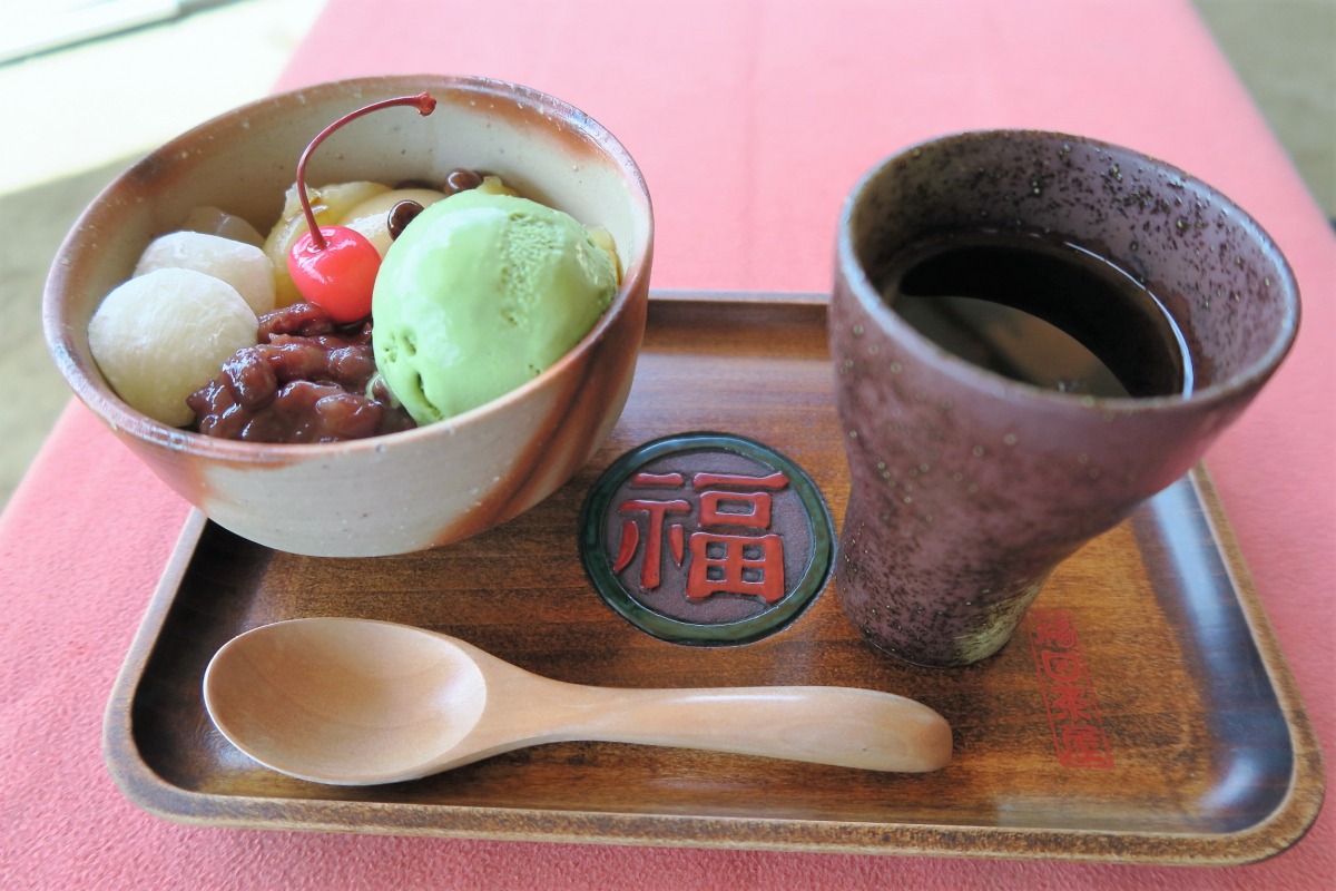 岡山後楽園内にある茶店のひとつ「福田茶屋」では、烏城彫のお盆で和のスイーツや飲み物が提供されます。 何が彫られているかはお楽しみ!図柄に込められた思いも、料理とともに味わってくださいね。