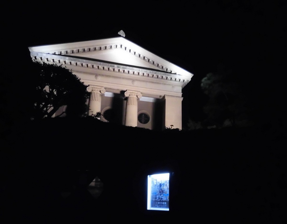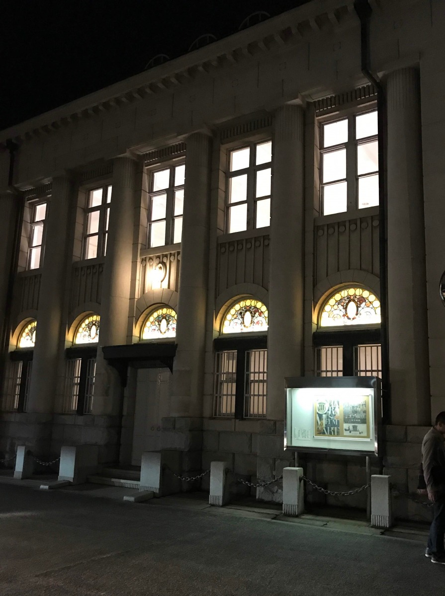 倉敷市の「夜間景観照明」にあわせて、大原美術館の外観もライトアップしています。
