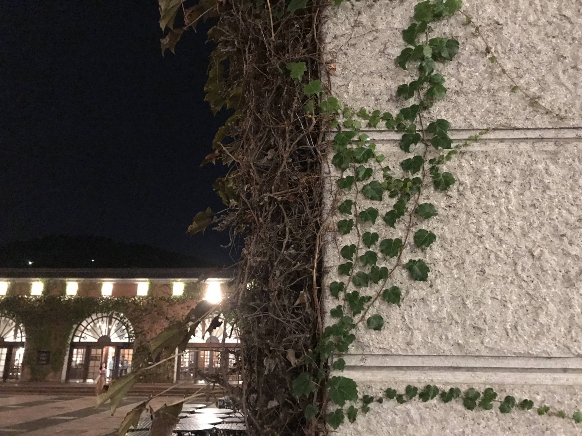 白壁の街並みに映える、蔦と赤煉瓦が美しい、「倉敷アイビースクエア」。