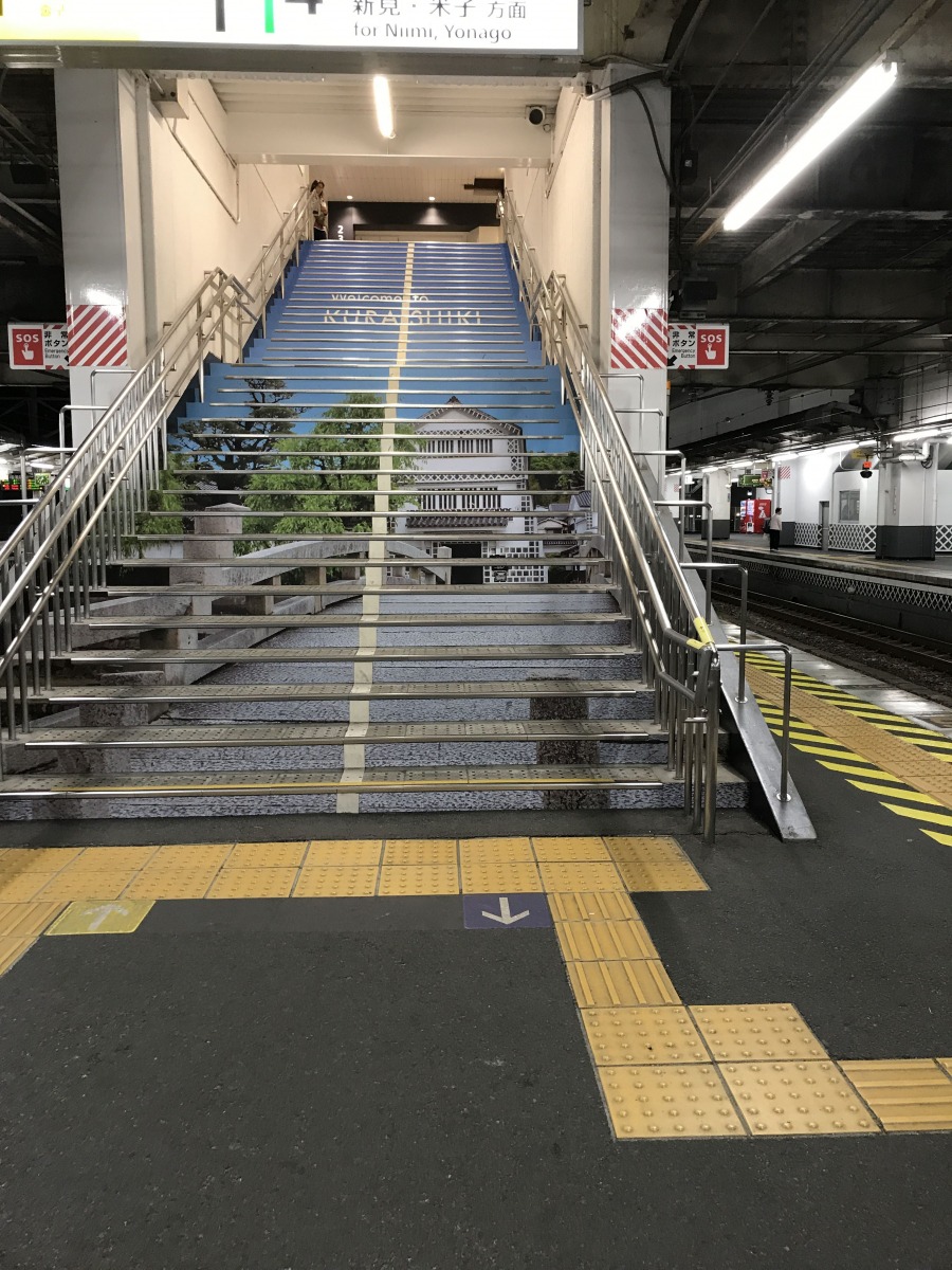 階段には、倉敷に来た気分が盛り上がるこんな歓迎の仕掛けも。