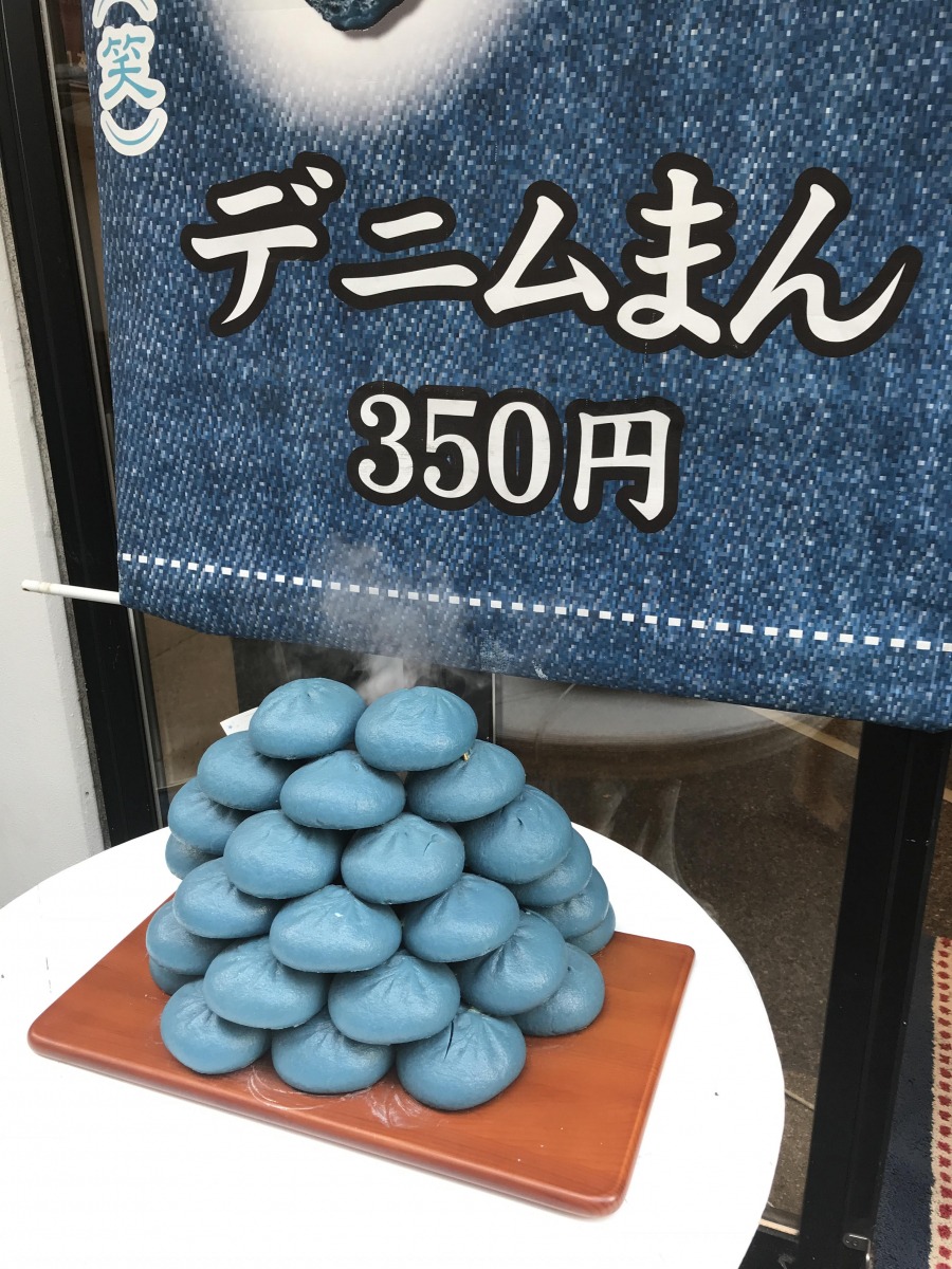 インパクト大の見た目に一瞬ひるんでしまいそうなこちらの豚まん「デニムまん」は、倉敷美観地区の「倉敷デニムストリート」限定! テイクアウトでひとつ350円で販売しています。