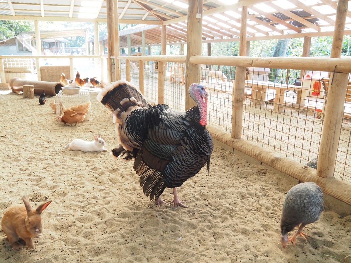 動物保育園コーナーでは、柵の中に人間が入り、ウサギやモルモット、シチメンチョウと触れ合うことができます。