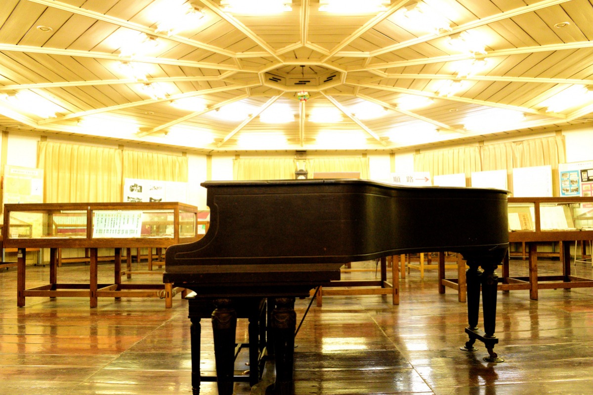 いつまでも眺めていたくなるほどに美しい八弁花模様の天井の空間には、倉敷の「教育」に関する資料がずらりと揃っています。存在感のあるピアノは昭和初期に宮内庁へ献上されたものと同じモデルとか。廊下には、珍しい呼び名のウシンガ(牛が引く木製農具)や旧倉敷幼稚園で使用されていた明治末期のヤマハのオルガンなど、レトロな品々それぞれにドラマが感じられます。