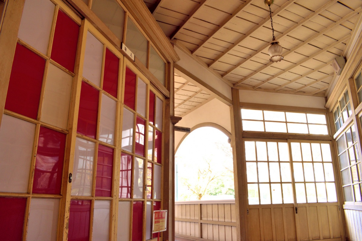 紅白の市松模様のガラス戸や窓のない廊下。花のようなシャンデリア。大正時代に建てられたとは思えない、教育に対する自由な発想が伝わってくるような斬新な建築様式も見どころの一つです。玄関前には、さくら幼稚園として親しまれたことにちなんだ2本の桜の木が植えられていて「満開の頃の眺めがおすすめですよ」とのことでした。