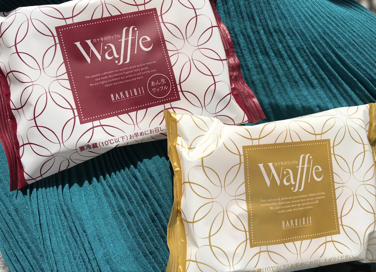 レトロでおしゃれな袋に入ったワッフルは、カスタードクリームの「ワッフル」と「あん生ワッフル」の2種類。