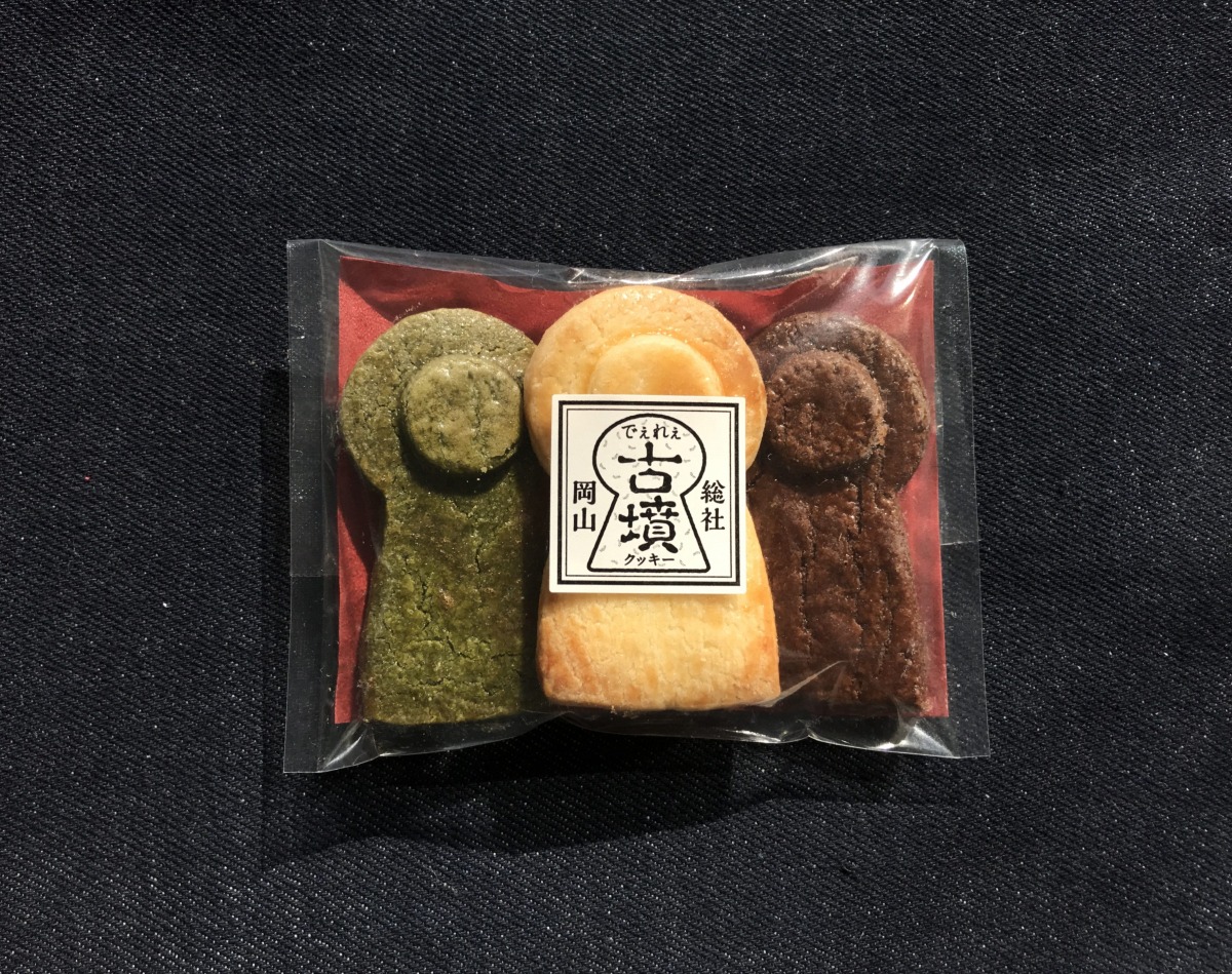 古墳が身近にある総社で生まれた、古墳の形をしたクッキーは、プレーン・チョコ・抹茶の3色。