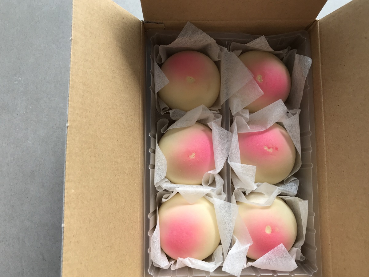まるで岡山名物の桃を箱買いしたかのような、それをさらに小さくしたような、愛らしい箱に入っています。