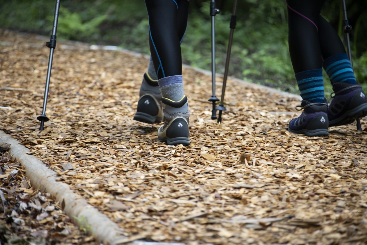 足元にはヒノキのチップ。森の中にのびる遊歩道を歩けば、リフレッシュ効果も満点です。