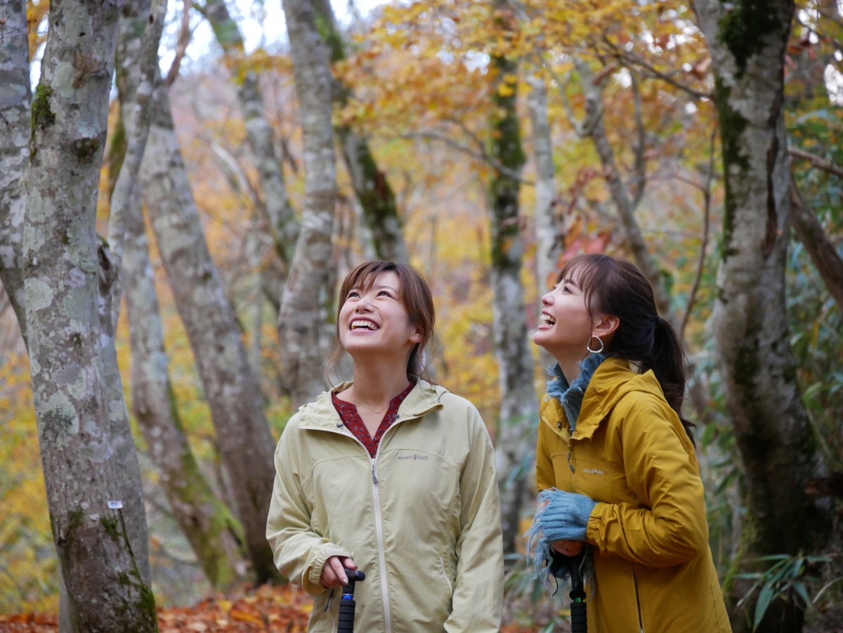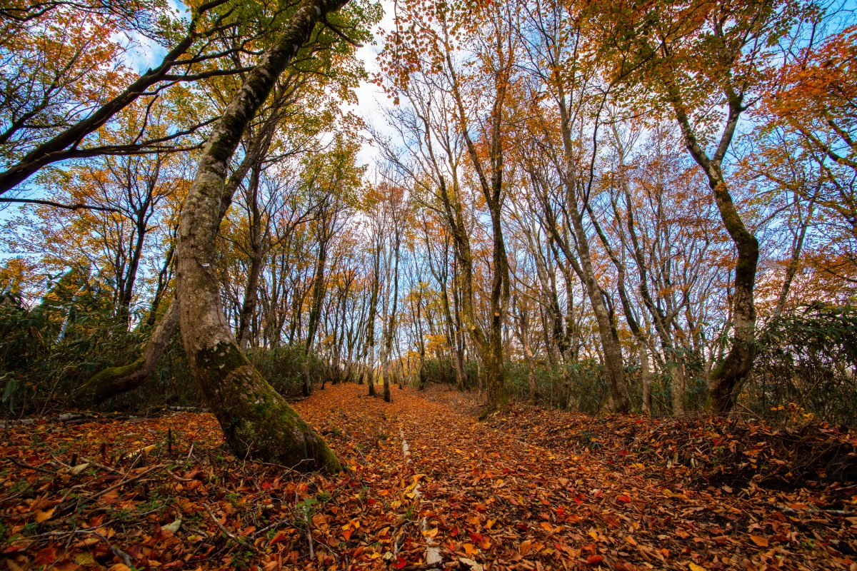 色づく木々はもちろん、落ち葉のじゅうたんも美しいブナの林。秋の青空と紅葉のコントラストは必見です。