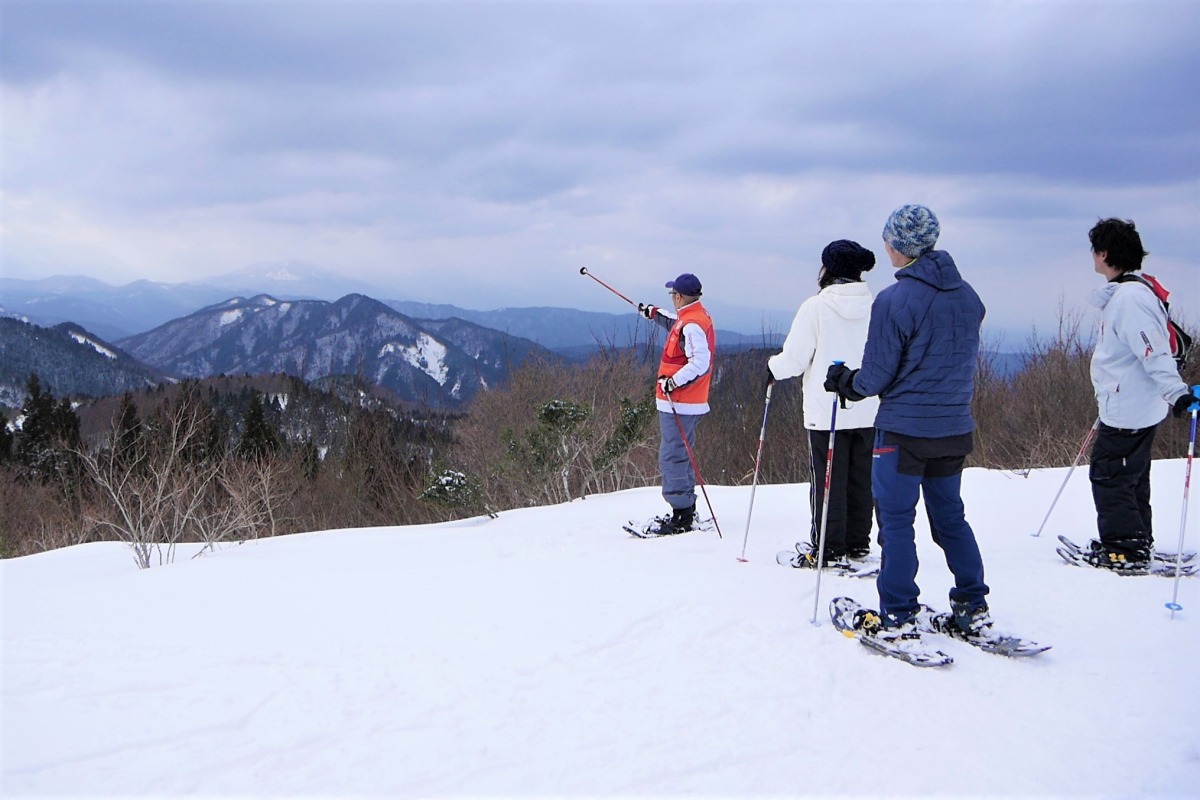 冬ならではの楽しみは、スノーシューやかんじきを履いて楽しむ雪上ハイク。空気が澄んだ冬の晴れた日には、中国山地の山々が遠くまで見渡せます。
