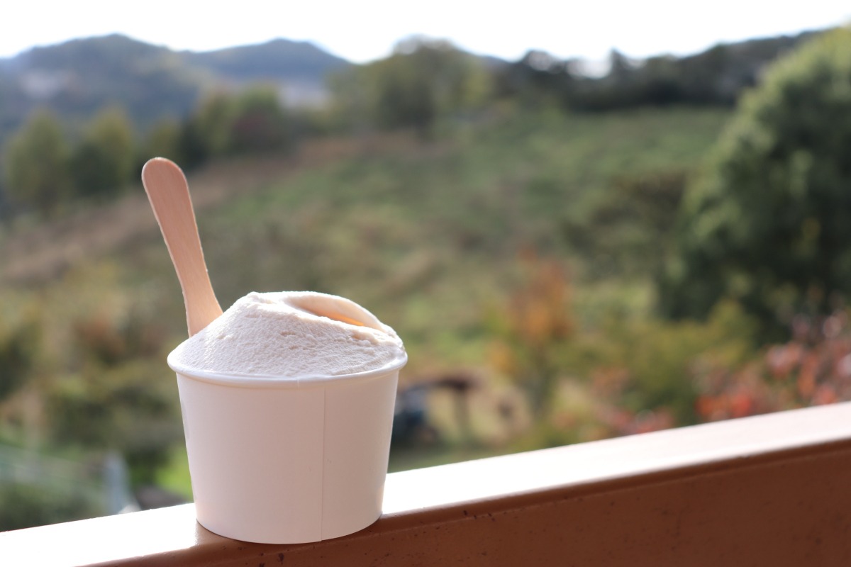 25ヘクタールの牧草地で、種付けから、生んで、放牧で育てられている一貫生産で、安全です。牧場ならではの、搾りたての生乳を、毎朝ジェラートに仕上げています。生乳のコクと、風味がしっかり出ていて、後味すっきりの上品な甘さとよくマッチしています。