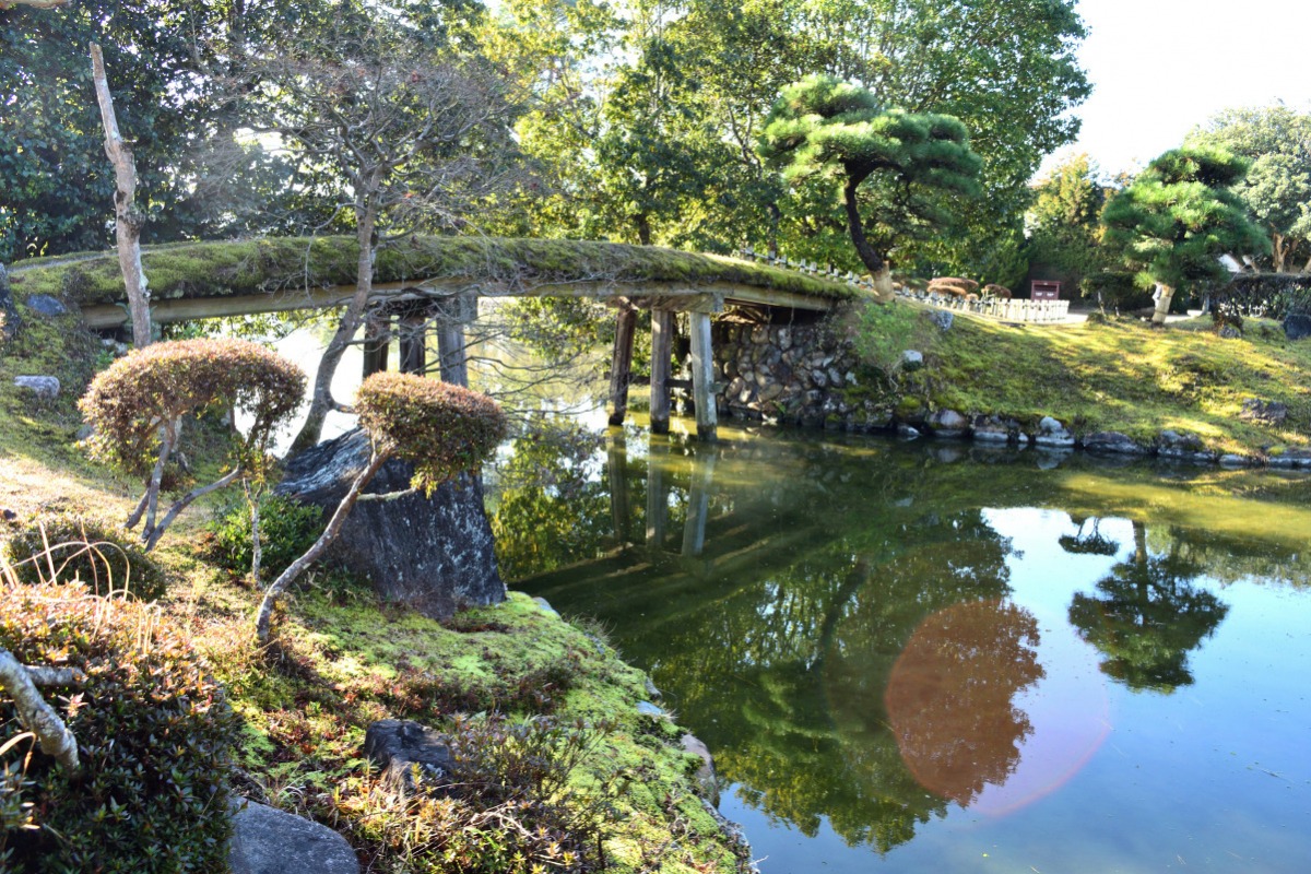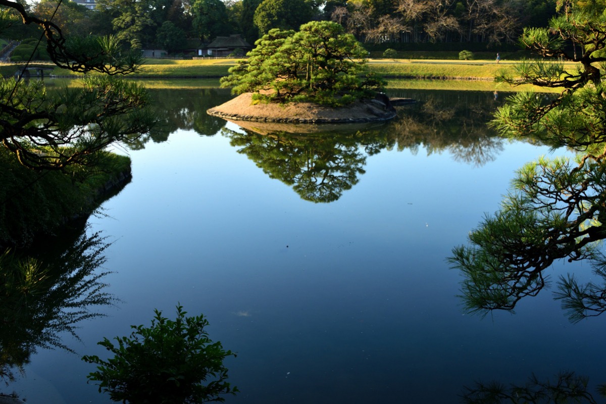 3つの池を石や木造りなどの橋が仕切っていて、細い橋を渡るドキドキ感もたまりませんよ。球体かのような島、悠々と羽ばたくシラサギたち、陽を浴びて輝く水面。裏門からつづく曲水など、水をめぐりながらぐるりと散策するのも良し。朝7時から開園しているので朝活にもおすすめです!