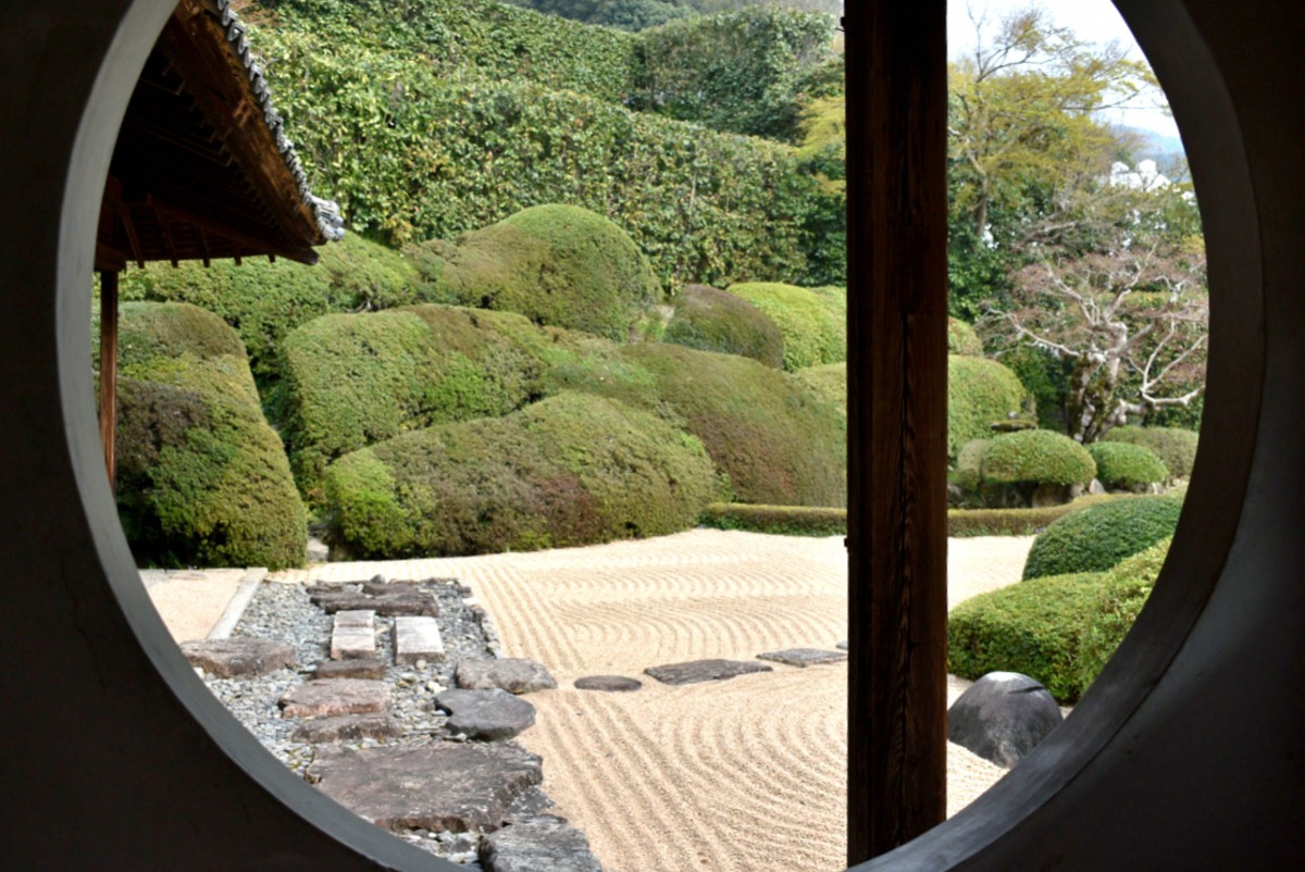 幾何学的なデザインが美しい枯山水庭園を、丸窓や縁側から時間を忘れて眺めましょう。大きく刈り込んで大波を表現したサツキ。羽のしなやかさを感じる鶴島。独特でありながらエレガントな魅力があふれるお庭につい引き込まれてしまいます。名古屋城や大阪城の天守閣の建築にも携わった、日本のレオナルドダヴィンチとも称される小堀遠州の傑作です。