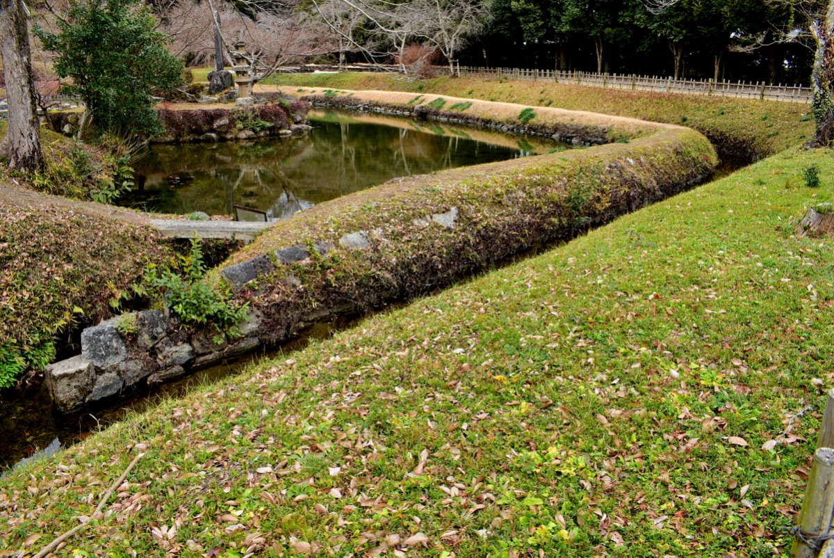 丸い池に沿うよう延びるお堀が歩道とも平行しているので、2重丸のようになった不思議なデザインです!すぐ横の足守川へとつながる澄んだ水。色鮮やかな紅葉。大輪のシャクヤク。足守川では桜並木や、ホタルやカワセミの観察など。自然に包まれて心がリセットされますよ。