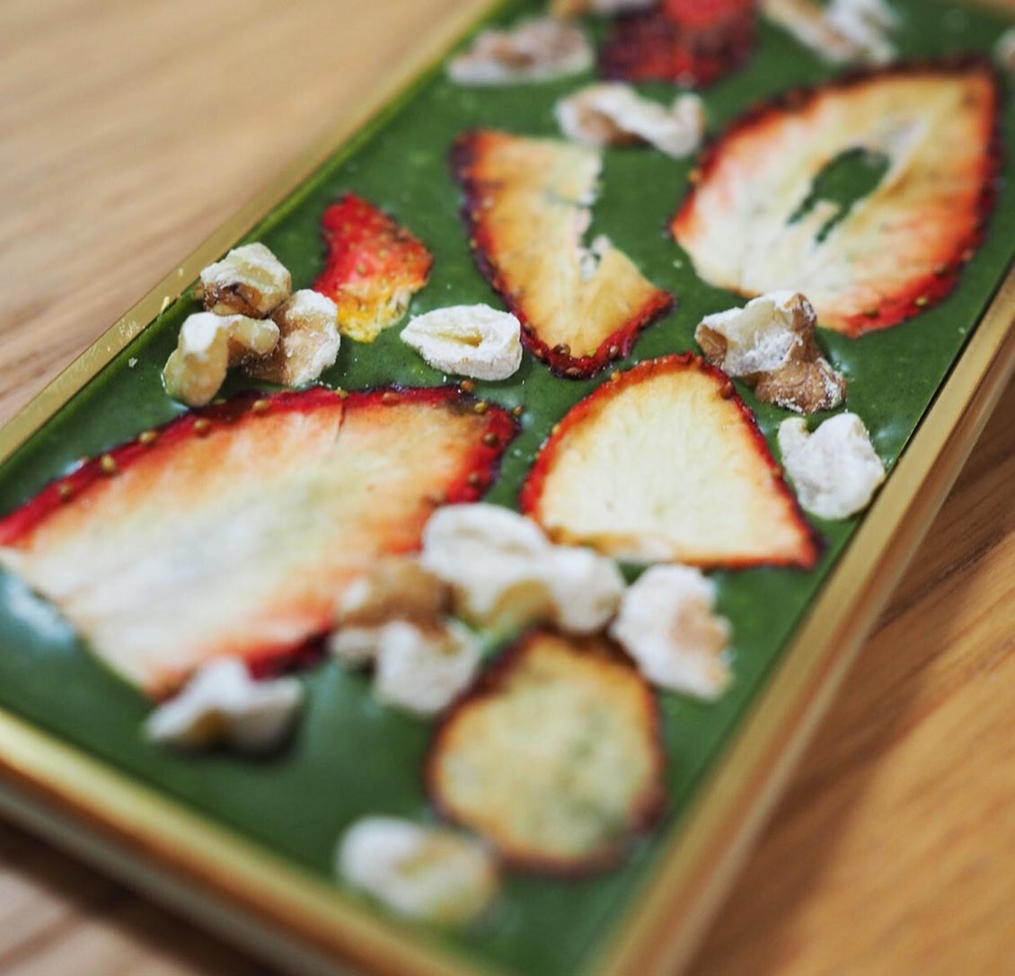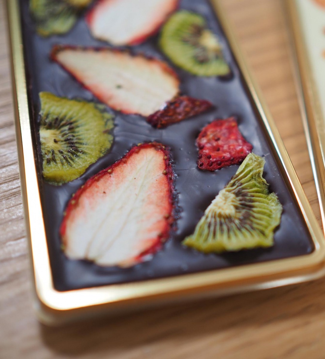 5種類ある中で、私のお気に入りは、「岡山産イチゴとせとうち産キウイのビターチョコレート」(税別600円)。甘酸っぱいイチゴとキウイのドライフルーツと、カカオ55パーセントの大人なビターチョコレートが相性抜群。