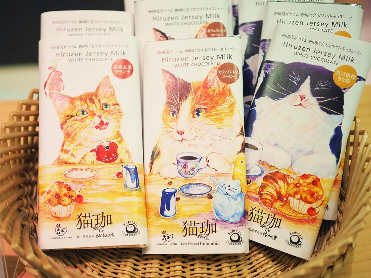 猫のパッケージが愛らしい、珈琲店がつくる、珈琲に合うホワイトチョコレート。「赤米玄米クランチ」、「黒豆粗挽きな粉」、「カフェインレスコーヒー」、3つの味があります。