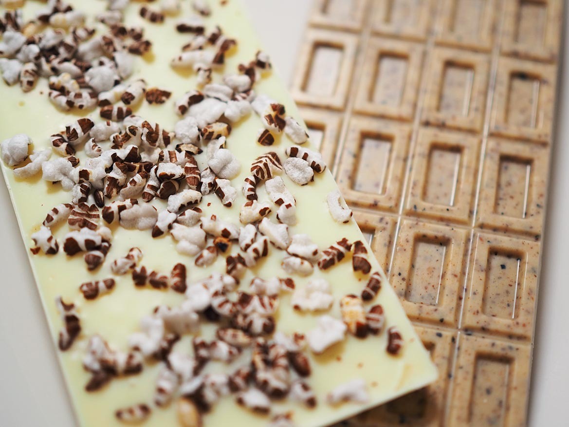 左が「赤米玄米クランチ」。赤米は岡山県産「あかおにもち」です。優しい甘さのホワイトチョコレートにザクッとした赤米の食感が楽しい!