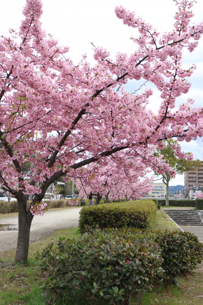 町中の親水公園の河津桜は、開花が堤防沿いよりも早めです。暖かい日が続くとあっという間に満開を迎え葉桜になってしまうのでお早めに。