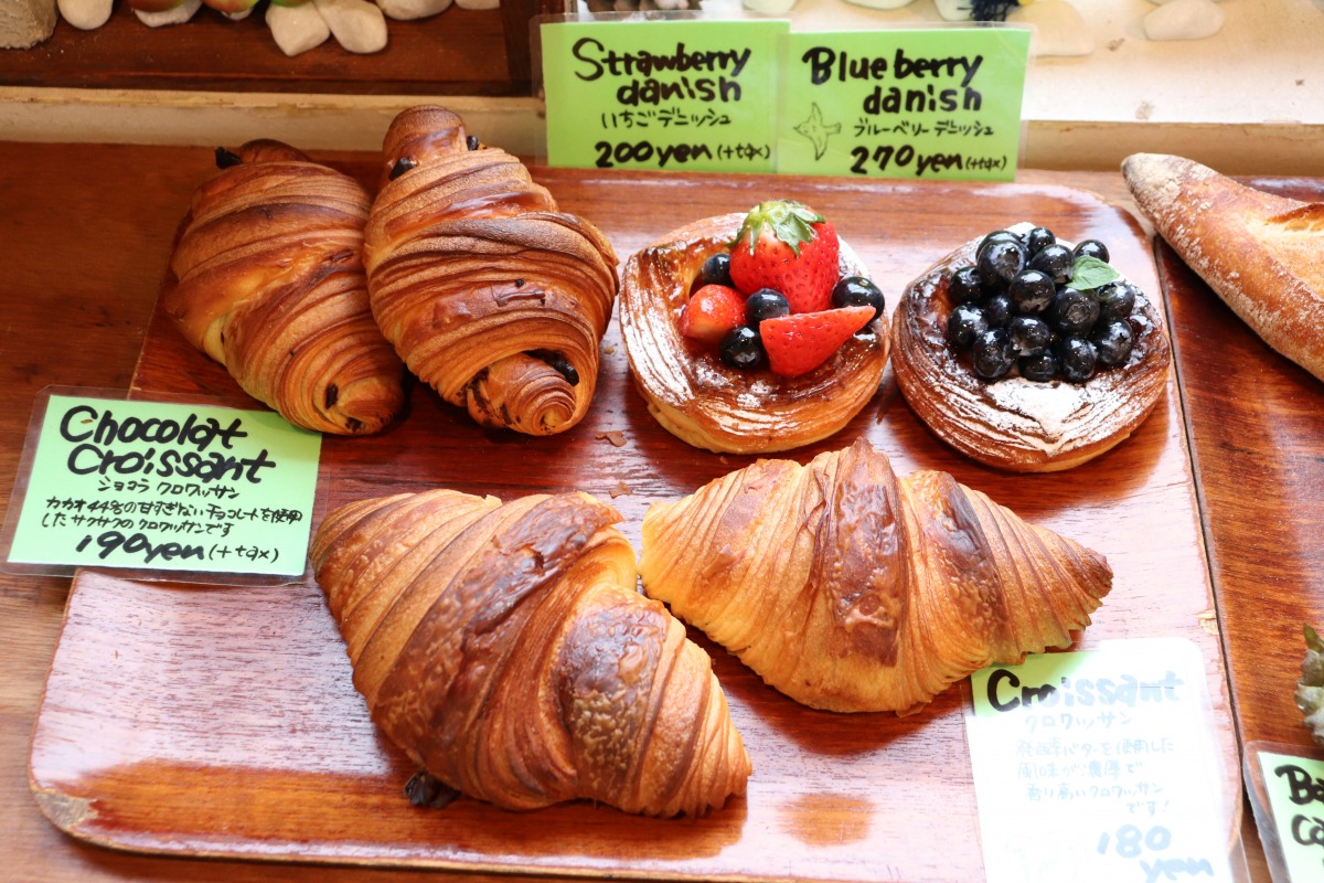 人気のクロワッサンは、歯ごたえがあり、それでいてもちもち感があってついついたくさん食べてしまいたくなる美味しさです。次の日でもこの感触が変わらず、美味しくいただけました。デニッシュも、季節ごとのフルーツを使ったパンがお店に並びます。岡山県産の桃、マスカットはもちろん、伺った日は、シーズンのイチゴ、ブルーべリーを使った、ケーキのようなパンが並んでいました。美味しいだけでなく、コスパがいいのも人気の秘密です。