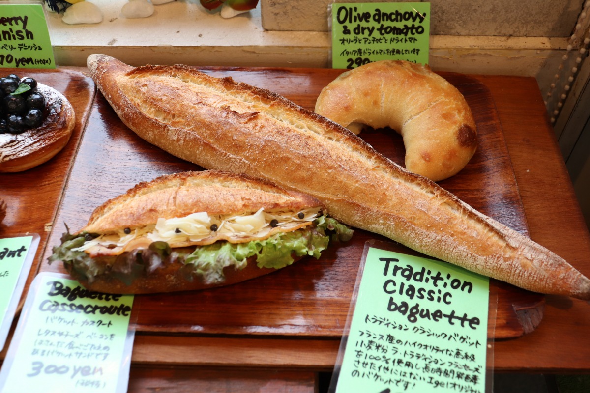 いろんな種類のパンが並ぶ中でも人気なのが、ハード系のバケットだそうです。オーナーさんがこだわり抜いて使う「トラディション」という小麦粉で作られたバケットは、やはり歯ごたえと味が違いました。曲がった形のパンは、イタリア産のアンチョビオリーブとドライトマトが入っていて、新しい感覚で美味しかったです。この日は、売り切れでしたが、カレーパンは絶品だそうです。