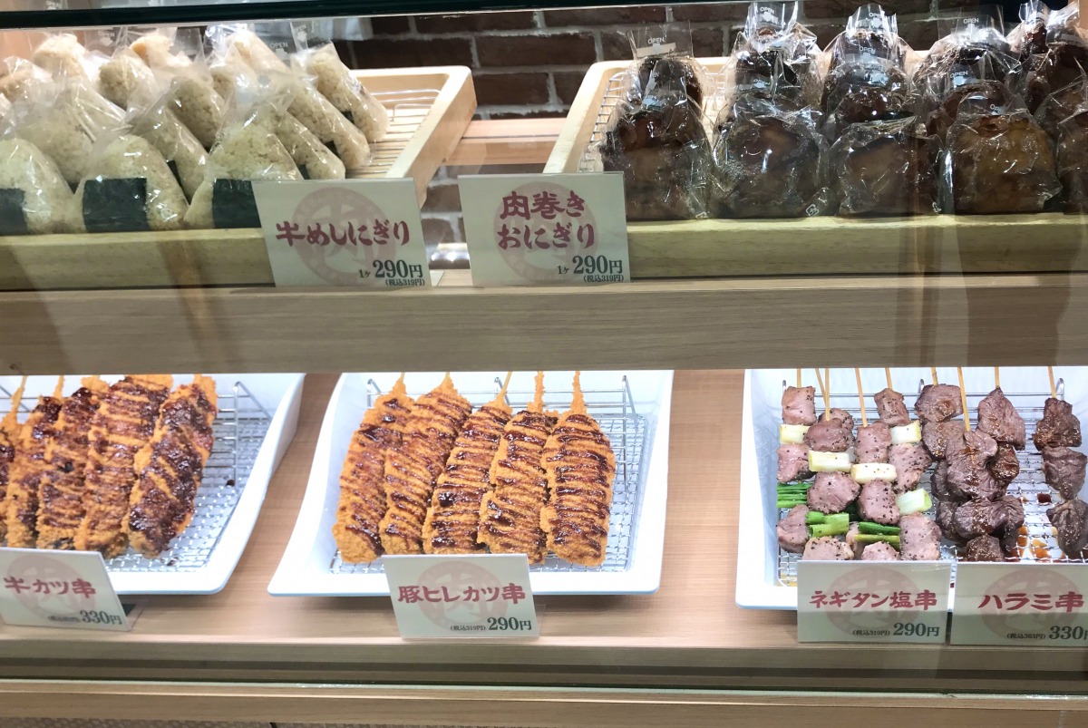 手軽に食べやすい「牛めしにぎり」やタレの香りが食欲をそそる「肉巻きおにぎり」、定番のメンチカツやコロッケのほか「ネギタン塩串」「ハラミ串」「豚ヒレカツ串」など串焼きや串揚げまで揃います。タイミングがよかったら、できたてがいただける時も!