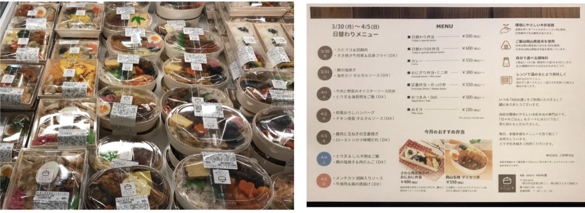 毎日7時から21時まで営業の「hibiki屋」は、「桃太郎の祭ずし」をはじめ岡山の駅弁といえば知らない県民はいない「みよしの」が始めた新しいスタイルのお店。ずらりと並ぶ圧巻のお弁当は、駅弁とはまた違ったリーズナブルなサイズと価格で、日替わり弁当もあり毎日来ても飽きません。