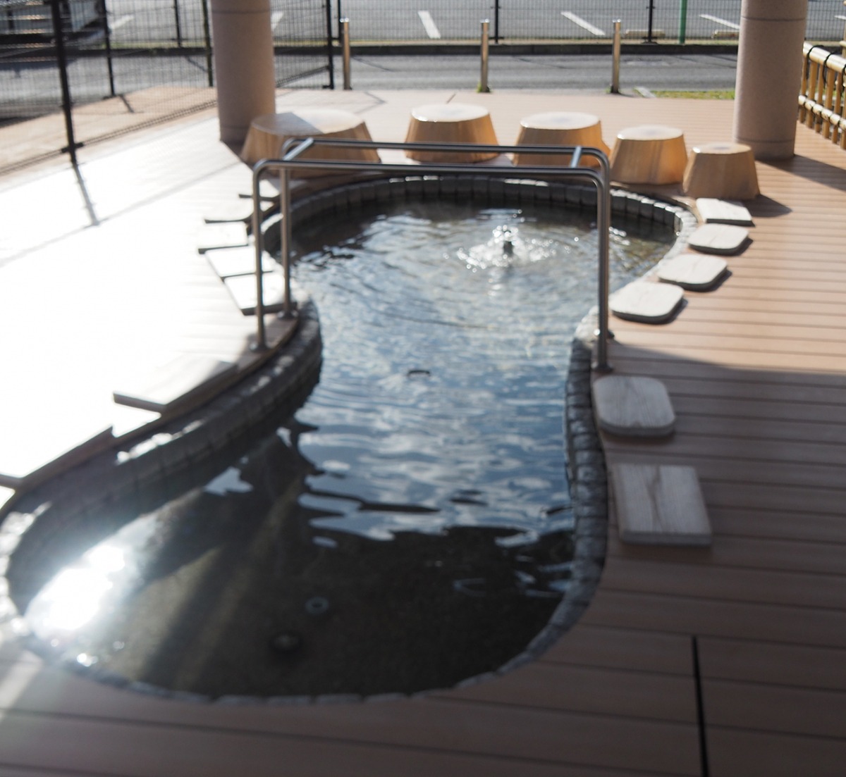 近くにある足湯「ふれあいの湯」は、大きな足跡の形になっています。美作地方に伝わる巨人伝説「三歩太郎(さんぶたろう)」の足跡をイメージして作られているそうです。