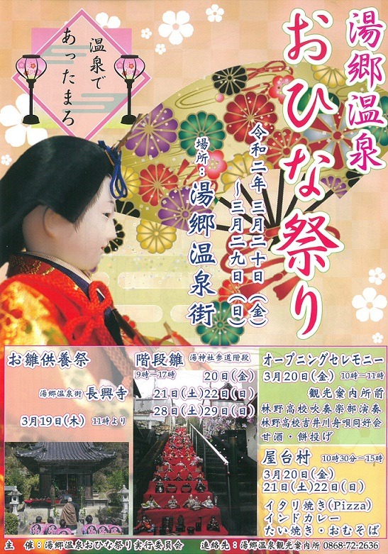 2020年は新型コロナウイルス感染防止対策のためオープニングセレモニーや屋台村が中止になりましたが、ひな人形の展示は3/20(金・祝)から3/29(日)まで実施中です。同時に「#ゆのごうおひなまつりフォトコンテスト2020」も開催されています。