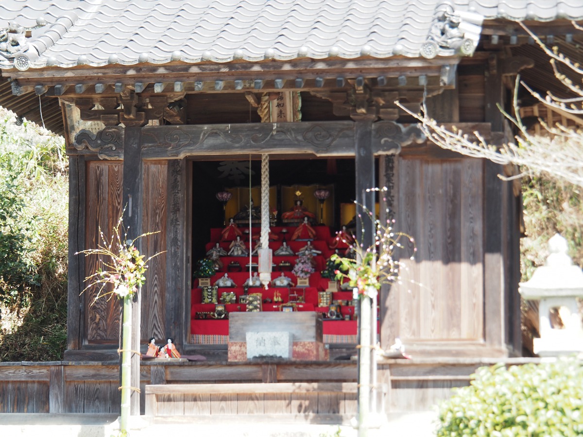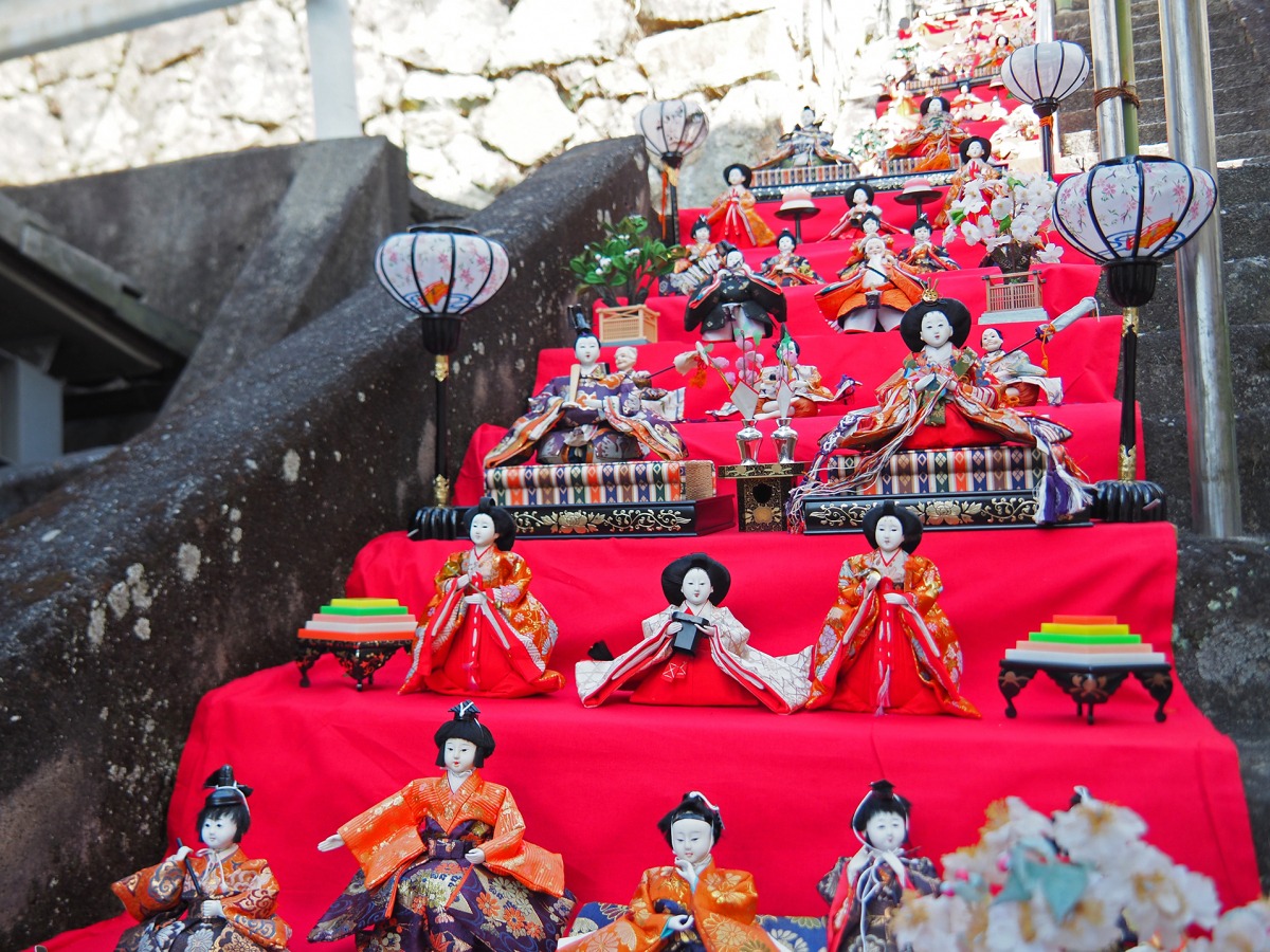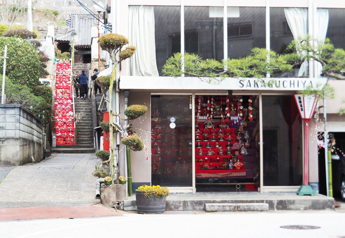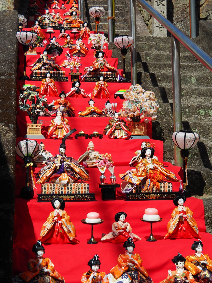 次はぜひ見てみたかった階段雛へ行きました。湯神社参道の階段で、土日祝日のみ見ることができます。約30段、ずらりと並ぶひな人形は圧巻!