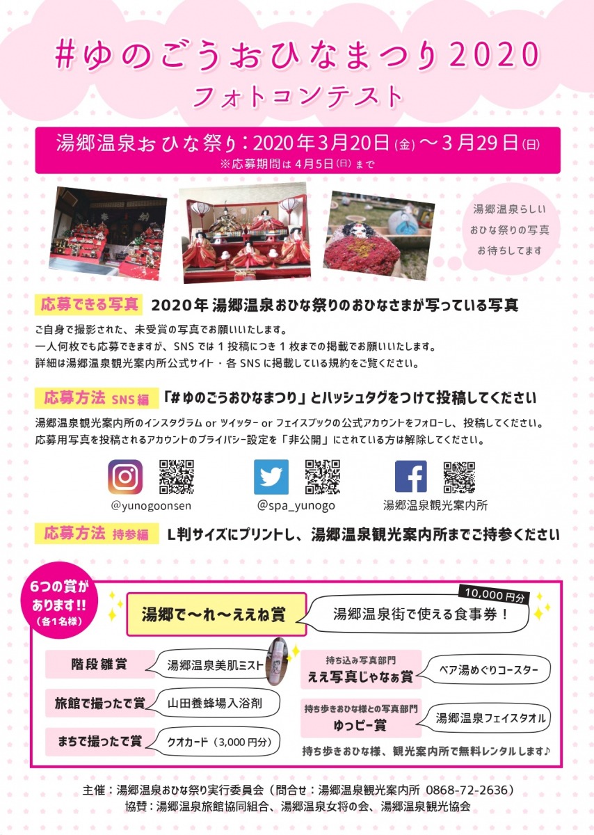 「湯郷温泉おひな祭り」と同時に、SNSでも参加できる「#ゆのごうおひなまつり2020 フォトコンテスト」が開催されています。写真の応募期間は4/5(日)までで、6つの賞があり、賞品も贈られます。