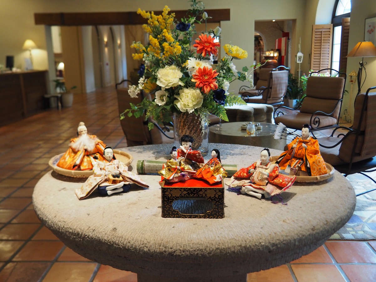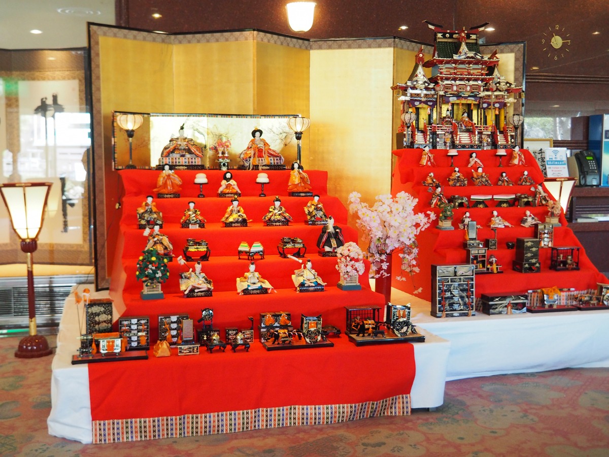 各旅館にもひな人形が飾られているので、ぜひ巡ってみてください。こちらは湯郷グランドホテルのひな人形です。
