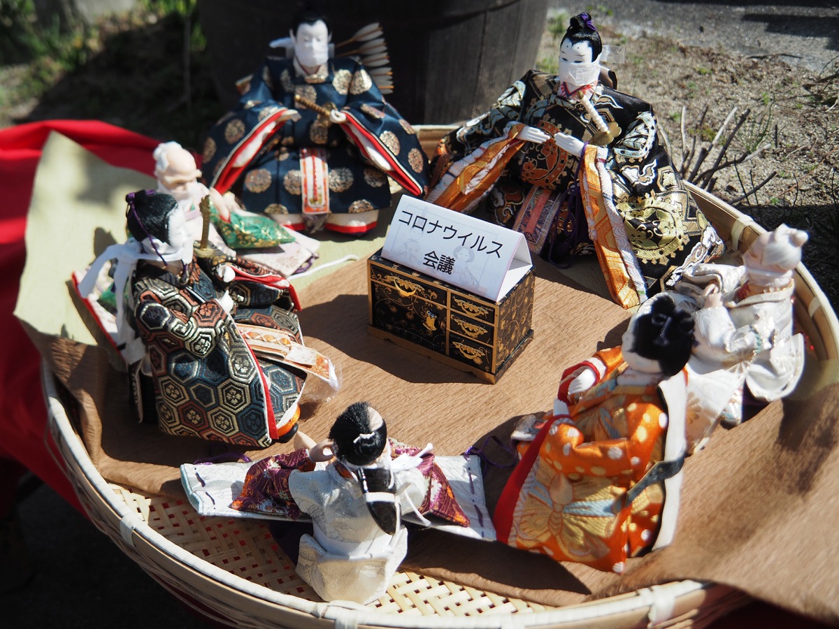 マスクをつけて会議をするひな人形。円仁法師像の近くで発見しました。ぜひ探してみてください。