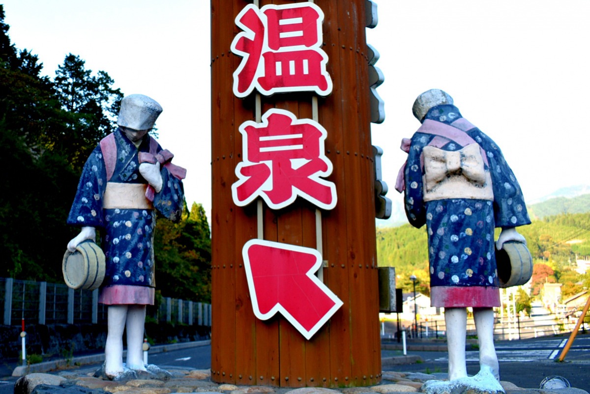 奥津温泉といえば「衣洗う奥津の親子」像が有名なのですが、実は温泉街へ向かう道の分岐点にも洗濯像があるんです!「歓迎!奥津温泉」と謳う看板の下で、うつむきがちに、足踏み洗濯にいそしむ姉さんたち。赤い腰巻や黄色い帯など、カラフルな出で立ちがとってもかわいいですよ!春を告げる洗濯ダンスのリズムが、聴こえてきそうです。