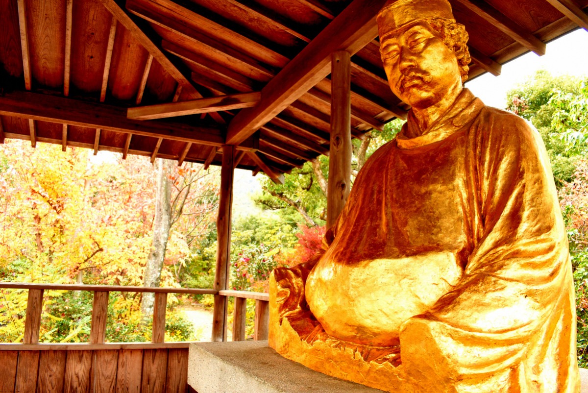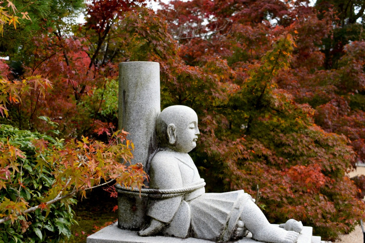 水墨画の巨匠・雪舟の像なら、宝福寺の方丈へどうぞ!とにかく太い柱。悟りきったかのような表情。修業をサボって絵ばかり描いていた雪舟が、ついには柱に縛られてしまったという「お仕置き現場」ならではのリアルな!??石像です。国宝級の作品を生み出すような画聖になったのは、こんな自由な子ども(小僧)時代があったからかもしれません。