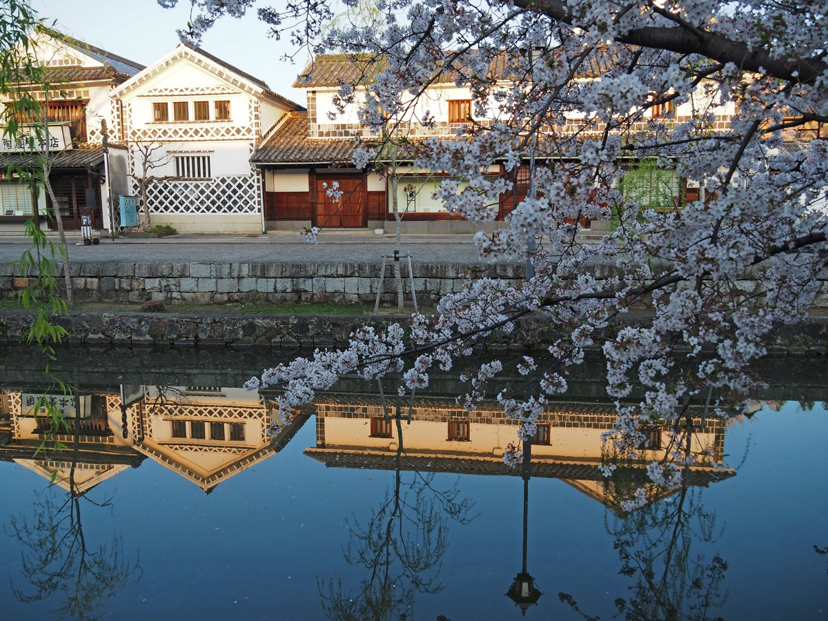 凪いだ倉敷川に、桜と柳と白壁が映り、美しい風景が見られます。