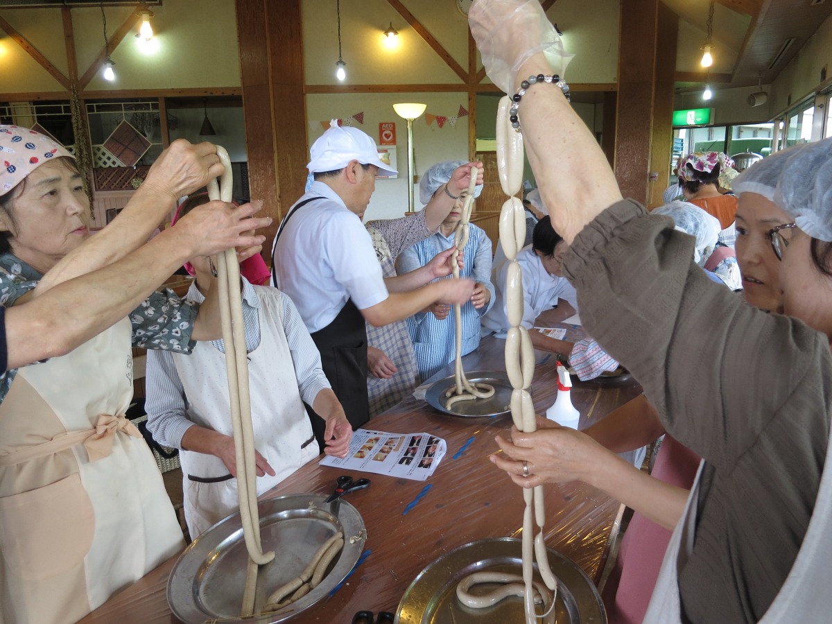 自分で岡山県産の豚ひき肉を羊腸に詰めてウィンナーの形に成形。ボイルをした手作りウィンナーはランチで食べられます。その場で焼きながら食べる美味しさは抜群です。