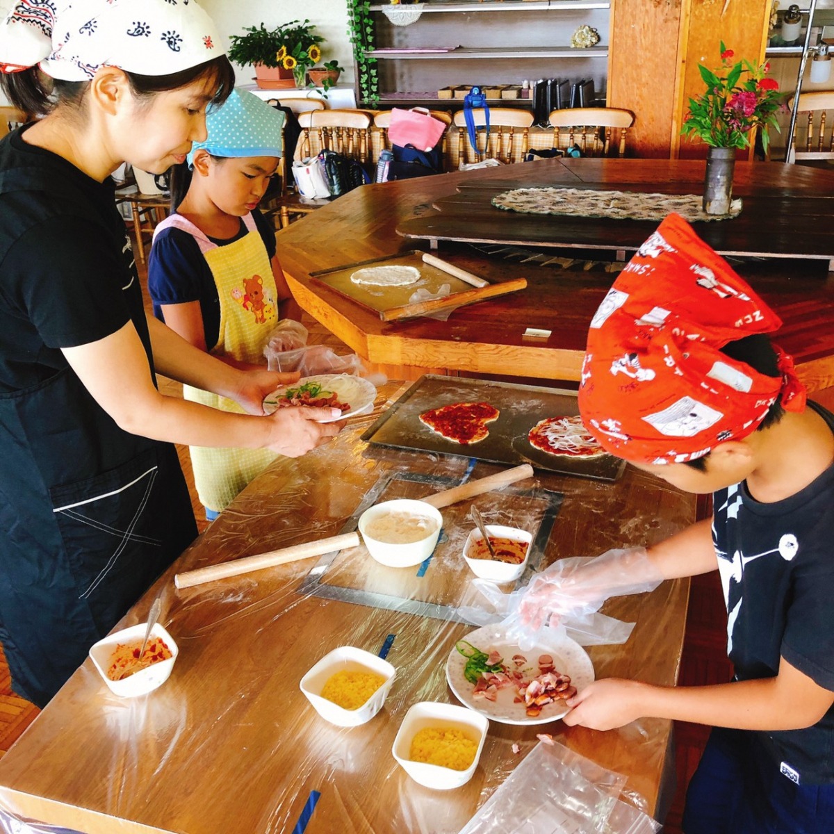 発酵させた生地をのばして、「まきばの館」特製ピザソースを塗り、具材をトッピングするピザ作り体験。チーズをたっぷりとのせて焼いたらできあがり。